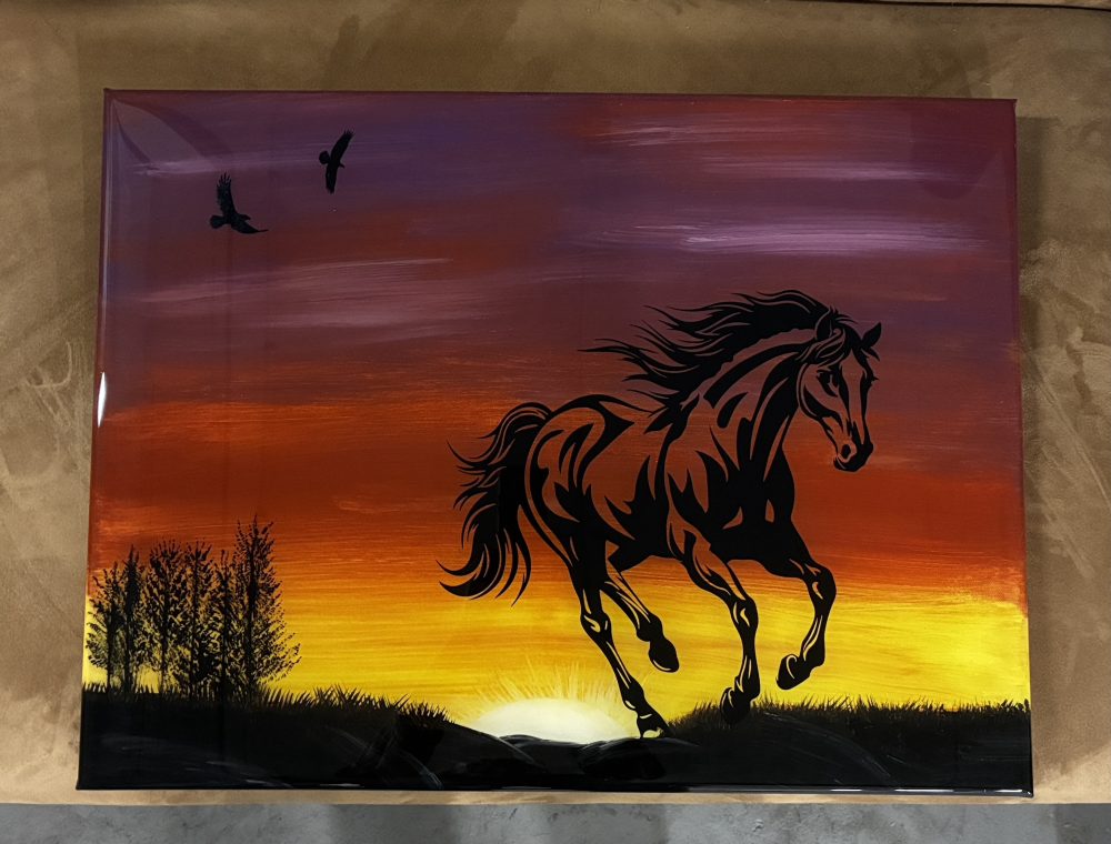 This canvas is 18″ x 24″ of a horse on the gallop at sunset
